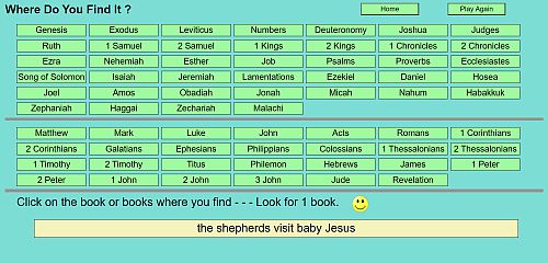 Click on "Bible" to test your knowledge of where to find stories and teachings in the Bible